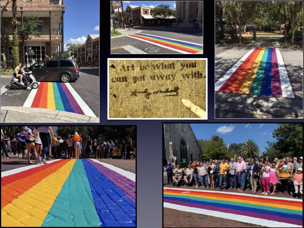 And by happy coincidence, our rainbows serve double duty. Art is an attention grabber. And the colorful crosswalks will hopefully remind drivers to slow down, take in the view and maybe enjoy Gainesville’s carefree, colorful ambiance.