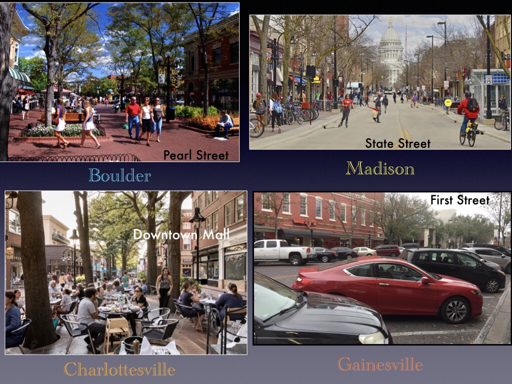 Gainesville and the University of Florida will soon collaborate on a new downtown master plan. If I were looking at ways to enhance downtown’s “street cred,” while making it a friendlier and more inviting place for dining, retail and relaxation, I’d consider turning SE 1st Street, from University Ave to The Hippodrome, into a “pedestrian zone,” following the Boulder and Charlottesville (people only) model or Madison’s (vehicles restricted) example.