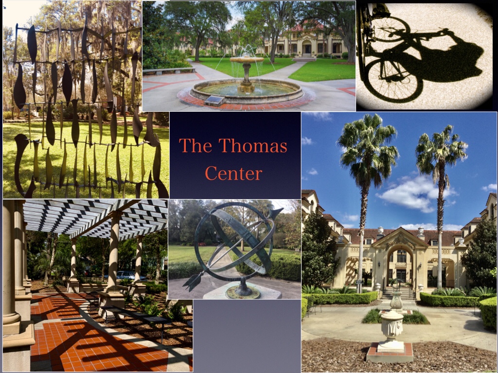 At 2.6 miles you have arrived at the Thomas Center. Giant oak trees, great fountain, wonderful Spanish style architecture and a sculpture that looks like dried fish hung out to cure. You will likely see folks doing yoga or picnicking on the lush green lawn. Need a break? Go inside and catch the latest art exhibit.