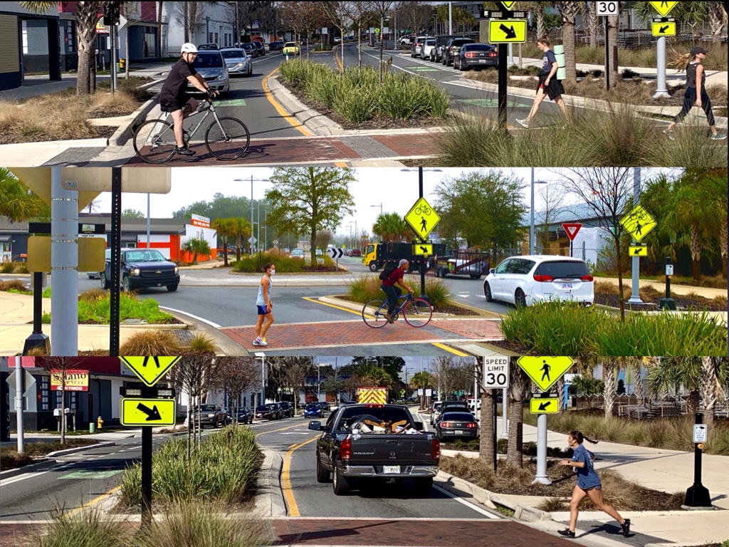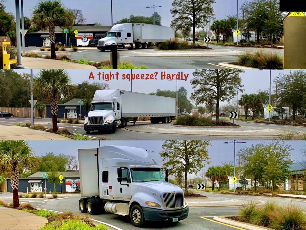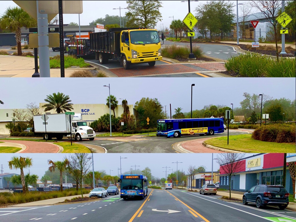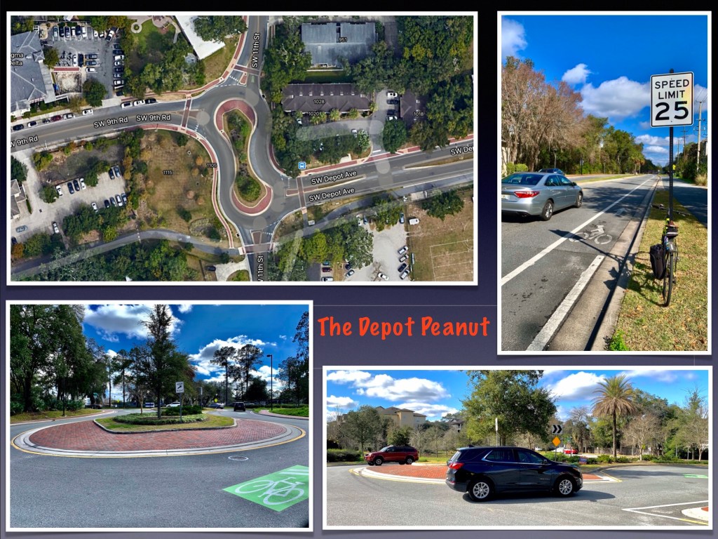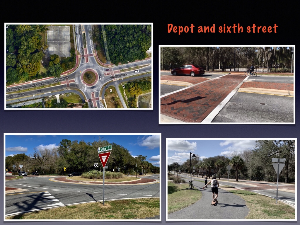 But enough about South Main. This is the “peanut” on Depot Avenue and SW 11th Street. It’s elongated, traffic-calming design makes life safer for P.K. Yonge students and faculty, residents of UF’s Sorority Row and commuters coming into town from Archer Road. It is designed to induce a slow but steady movement of traffic while accommodating non-motorists.