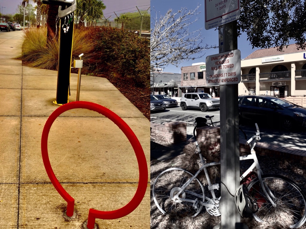 South Main has a self-service bike repair facility. University Avenue has a ghost bike to memorialize a dead cyclist. One corridor welcomes cyclists, the other dares them to survive it.