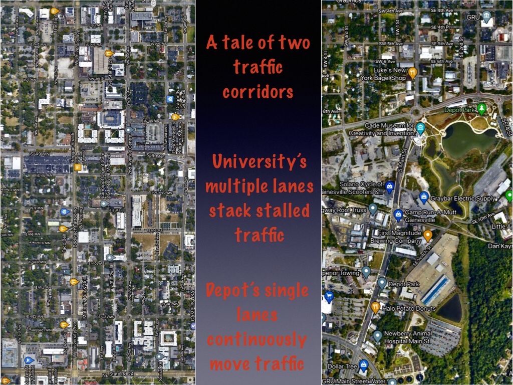 The amount of traffic on University Avenue far exceeds Depot Avenue. It is a State Rd with a fair amount of thru traffic, whereas both Depot and Main St of modest, limited length. If University jams up look for cars to escape to either 8th Ave or the now pleasant 2nd Ave. (Pleasant until you get stuck behind that autonomous turtle. ) You are a dreamer, and not the only one, and I love the road changes you’ve recounted. I just think THIS challenge is beyond reality to as being as artfully done as at the other locations.