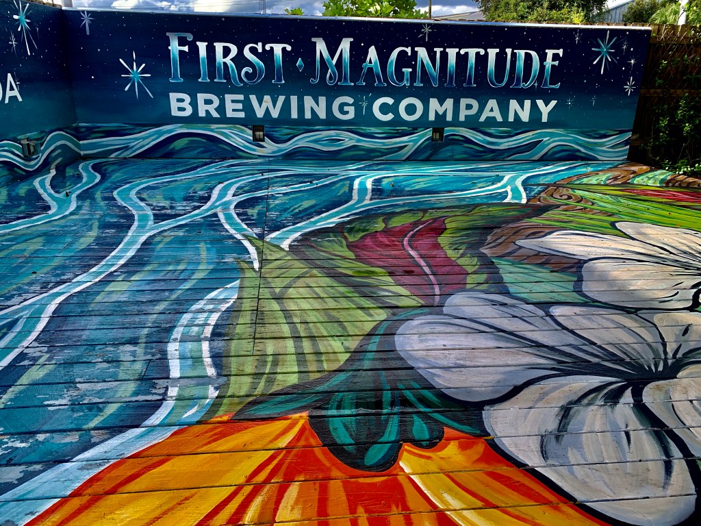 In front of First Mag is a Horner mural depicting cyclists racing across Paynes Prairie, which she said “reflects the brewery’s theme of community and the outdoors. It was a colorful, funky version of people coming in off the trail.”