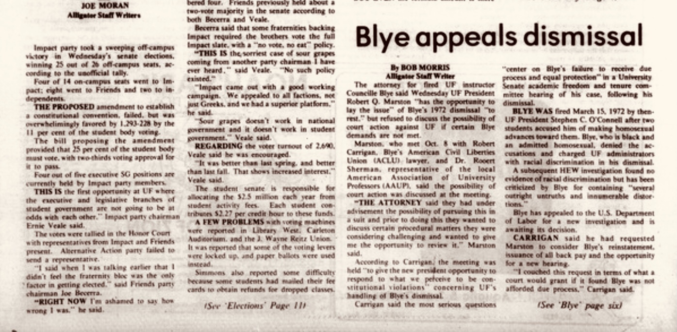 Tigert Hall was unmoved. It remained adamant when the ACLU and the American Association of University Professors took on his cause. When William Raspberry, of the Washington Post, wrote about Blye. And when The Alligator, The Sun and newspapers around the state took an interest.