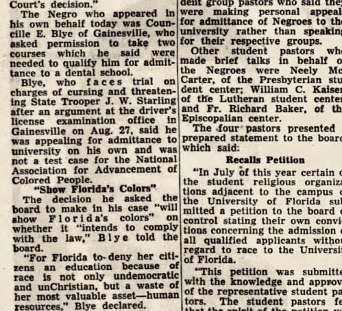 Blye could speak with some authority on the issue of discrimination. Born and raised here, he had been the first African-American to seek admission to the University of Florida; in 1949, when it was illegal for a black to attend Floridas all-white flagship school.