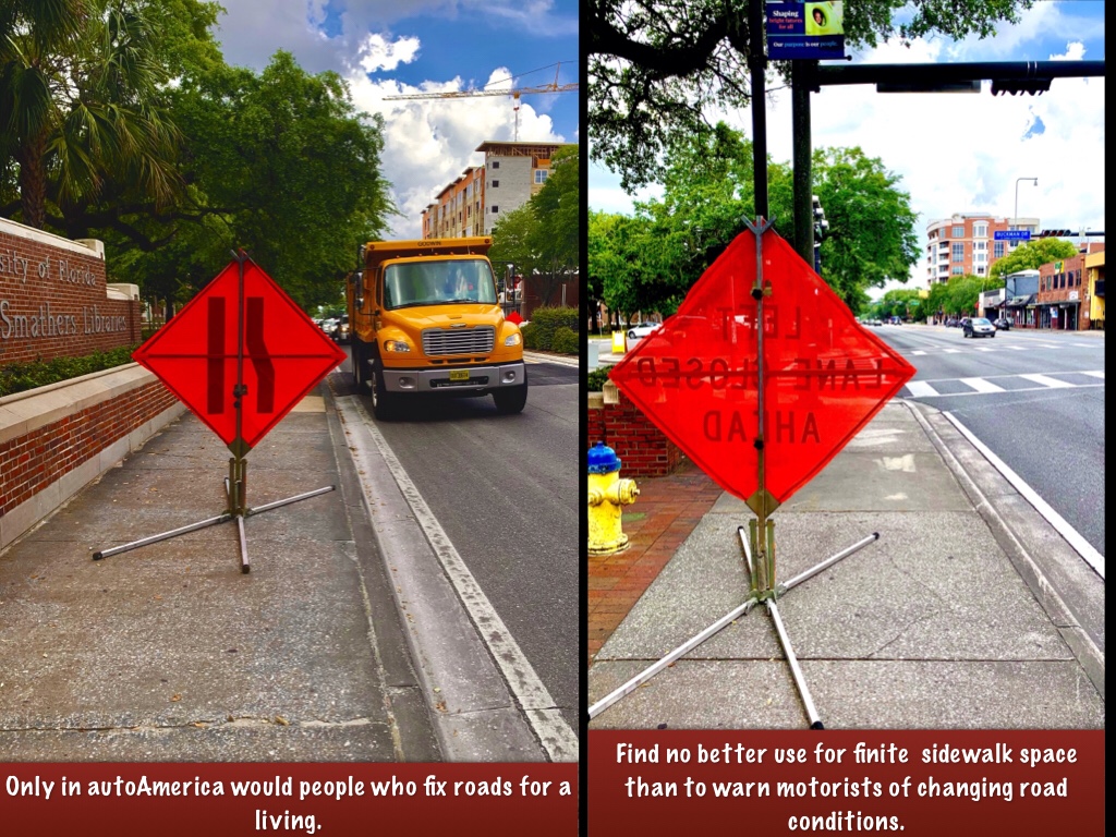 Naturally they have appropriated finite sidewalk space for signs alerting motorists to changes in traffic patterns.