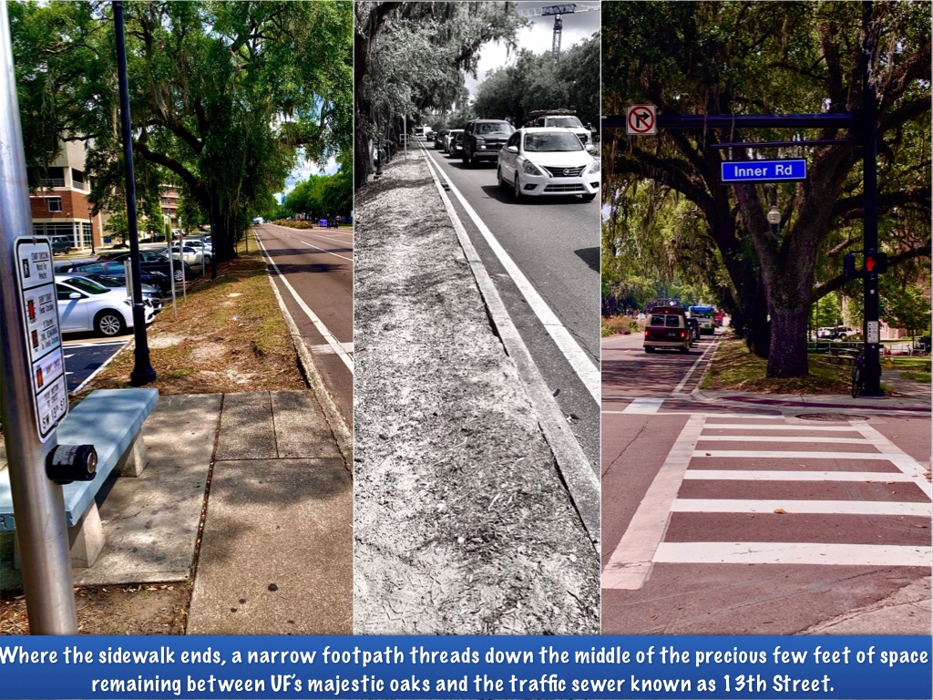 The University of Florida is the epicenter of foot traffic in GNV. It’s always amazed me that a university surrounded on four sides by highways has such inadequate sidewalks to protect its students.