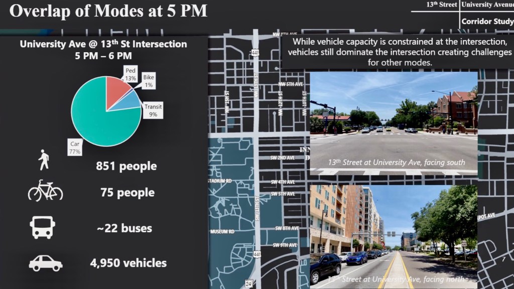 Do pedestrians count? More than 3,000 pedestrians will cross the intersection of University and 13th Street….ground zero….during the most intensive travel hours of the day. “We’re looking for wholistic solutions, with more space for pedestrians and bicyclists,” said Arms.