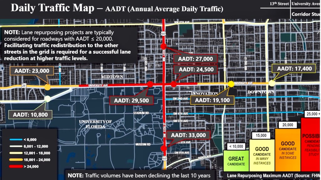 But it is also important to understand that traffic levels on University and 13th have declined over the past decade. This, Arms said, due to some motorists shifting to other modes of transportation or using “other traffic corridors” for their commutes.