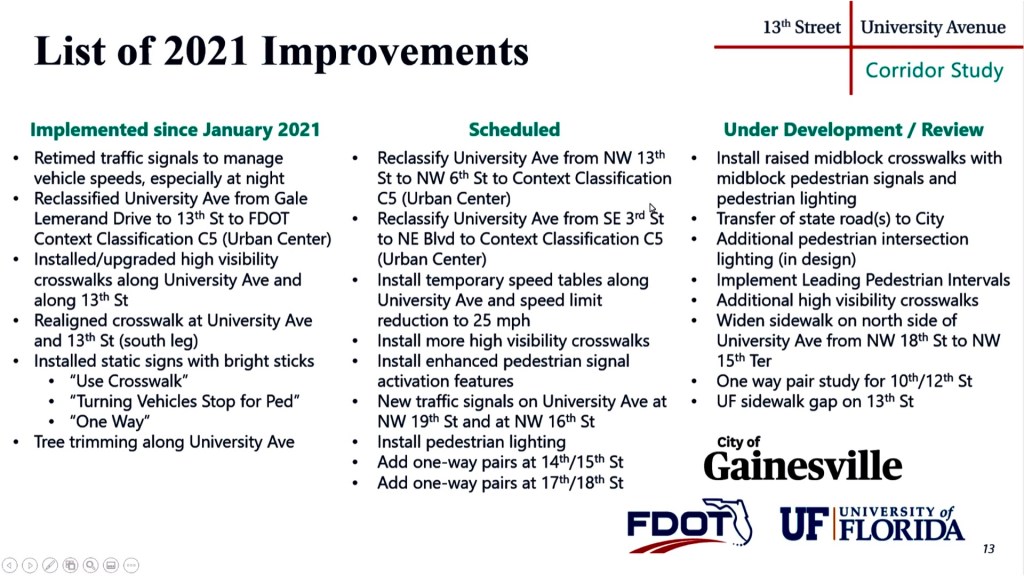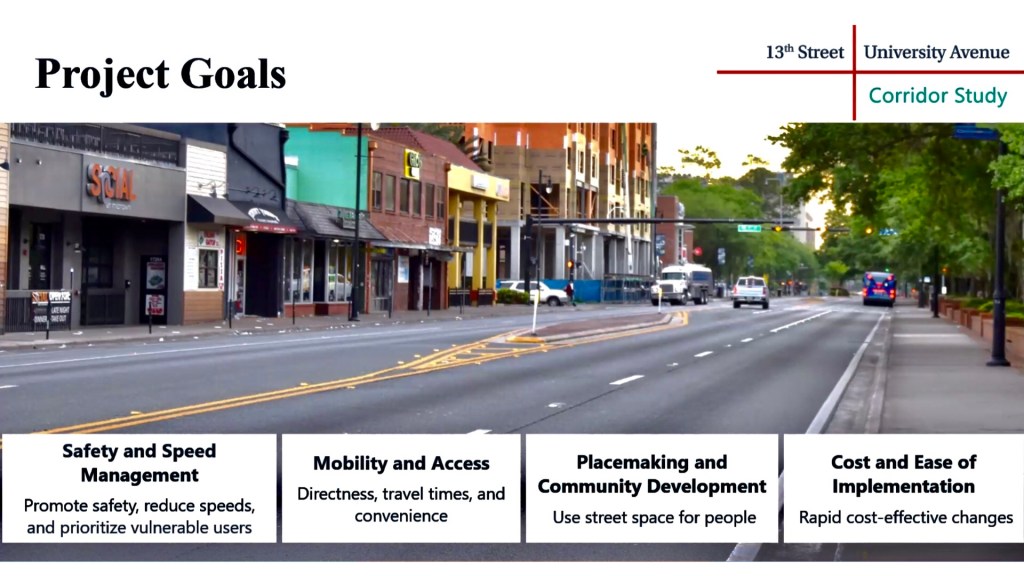 The objective of the study being to “improve safety and prioritize people,” HDR associate Vice President Jeff Arms said during a recent Zoom briefing sponsored by Gainesville Citizens For Active Transportation, GCAT. “Designing space for people using all modes of transportation,” people “of all ages and abilities.”