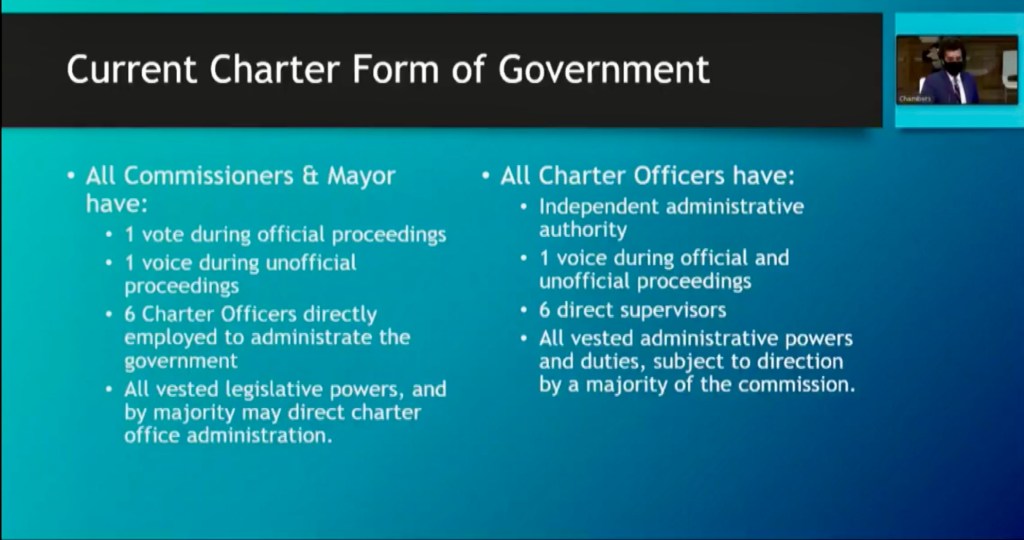 Under the existing system, the mayor serves as both presiding officer (runs the meetings) and has one of seven commission votes. Beyond that he possesses no individual authority not shared by his fellow commissioners.