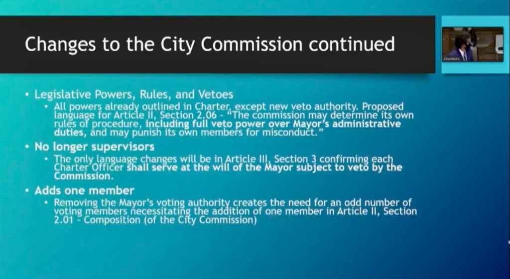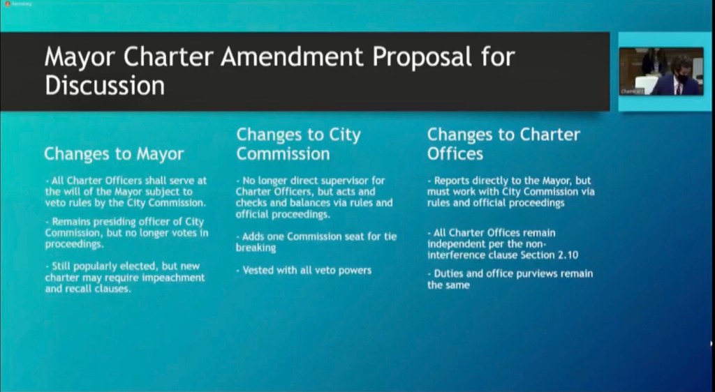 Arreola’s hybrid proposal suggests that all charter officers serve “at the will of the Mayor” But that the mayor’s charter hires and fires would be “subject to veto rules by the City Commission”