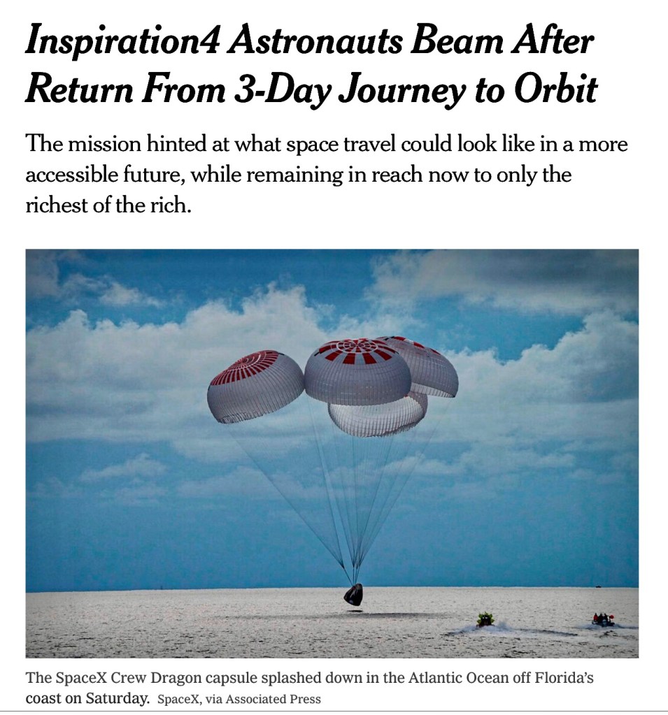 True, these first SpaceX passengers were more or less “everyday people.” But that was just for show. As the Times reported: “Orbital spaceflight is still far too expensive for anyone except the richest of the rich, but by giving a chance to people who represent the larger society, Mr. Isaacman said he hoped to inspire a future generation to dream bigger.”