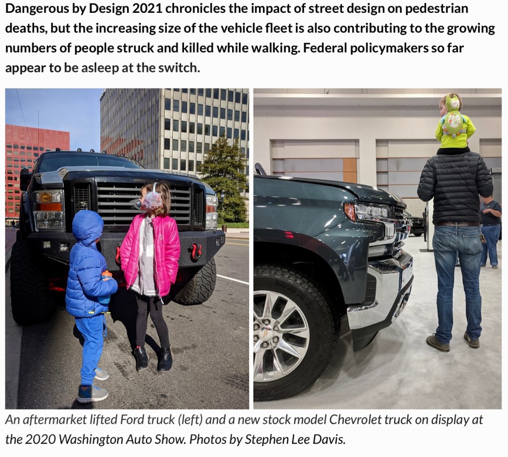 And let’s not kid ourselves: Size matters when it comes to autoAmerican Anarchy. “To put it simply, pickup trucks and SUVs are two to three times more likely than smaller personal vehicles to kill people walking in the event of a crash. Recent research from the University of Wisconsin-Milwaukee found the share of pedestrian deaths involving trucks, vans, and SUVs has increased from 22 to 44 percent since the mid-1980s. More SUVs and trucks in the fleet = more pedestrian injuries becoming deaths instead.”