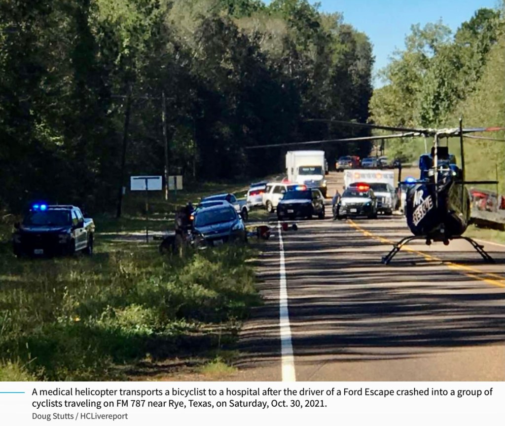 “A Massachusetts man was killed outside Houston Saturday when a driver crashed into a group of cyclists who were near the midway point of a 2,400-mile cross-country bicycle ride,” reports the Chronicle. “The driver was released from the scene without charges or a citation despite the initial police note about his speed. Investigators with Texas DPS are continuing to piece together what happened and will determine if charges are to be filed…The driver was three miles away from home when the crash occurred.”