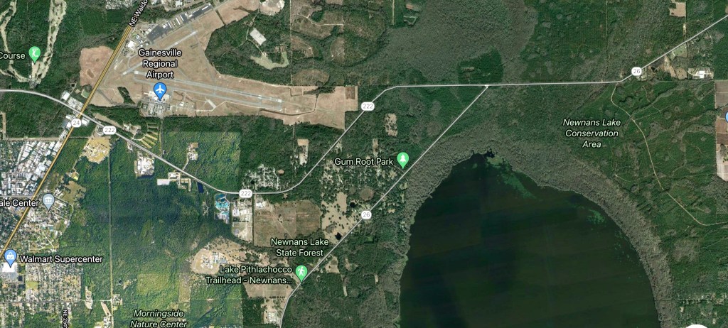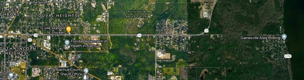 But from Waldo Road east all the way to where it dead ends at Newnans Lake, the character of University Avenue is altogether different. From SE 24th St. east tt is largely residential and lined for long stretches with dense woods.