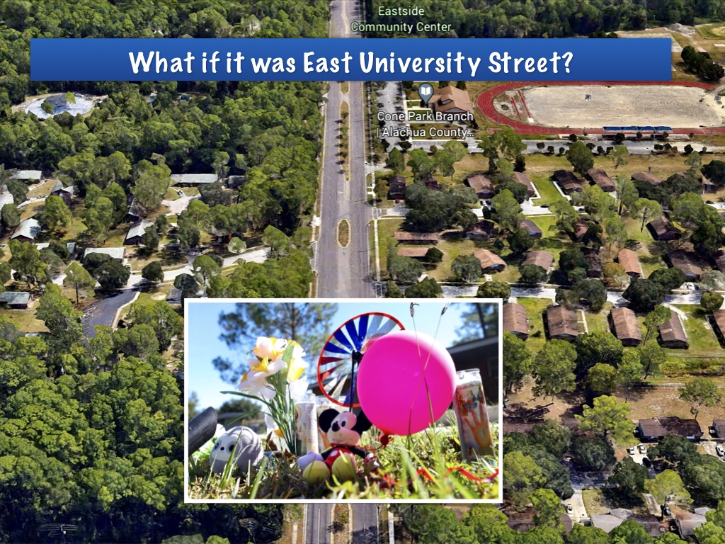 I’d hate to think the answer is yes. But ultimately it will be up to FDOT to decide whether the death of a four-year-old East Gainesville child is just the occasional price we have to pay to keep autoAmerica moving through the heart of Gainesville as quickly and as efficiently as possible.