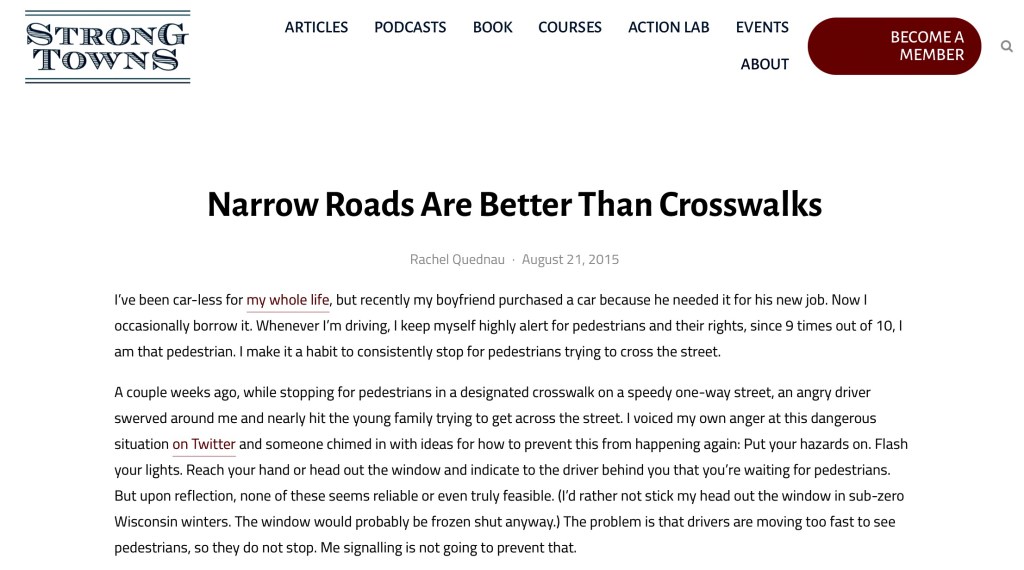 The above quote comes from a perceptive blog by Rachel Quednau, program director for Strong Towns. Anyone who follows Strong Towns should understand that slowing cars so as to reduce traffic violence is never as simple as laying down the occasional crosswalk.