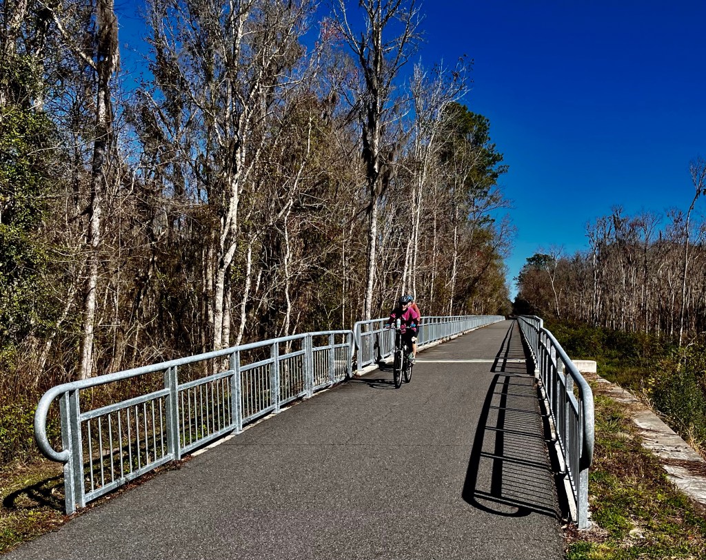 At trail’s end you reach Memorial Bridge, which crosses the St. John’s River into Palatka. The bridge sports a protected bike-ped lane that is physically separated from traffic. So feel free to cross and check out the town’s work-in-progress historic waterfront. Visit the St. John’s River Center while you’re in the neighborhood.