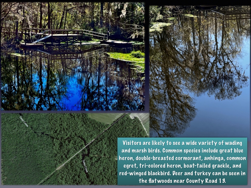 Soon after leaving Armstrong you will cross Deep Creek, with its dark waters and swampy banks. From the bridge you can see a boardwalk that leads to a “swimmin’ hole.” Watch out for gators and snakes though.