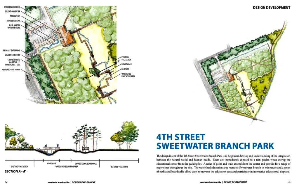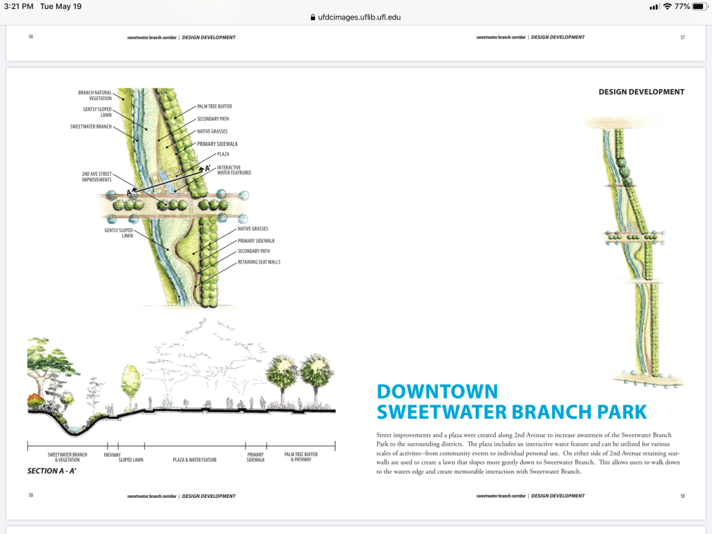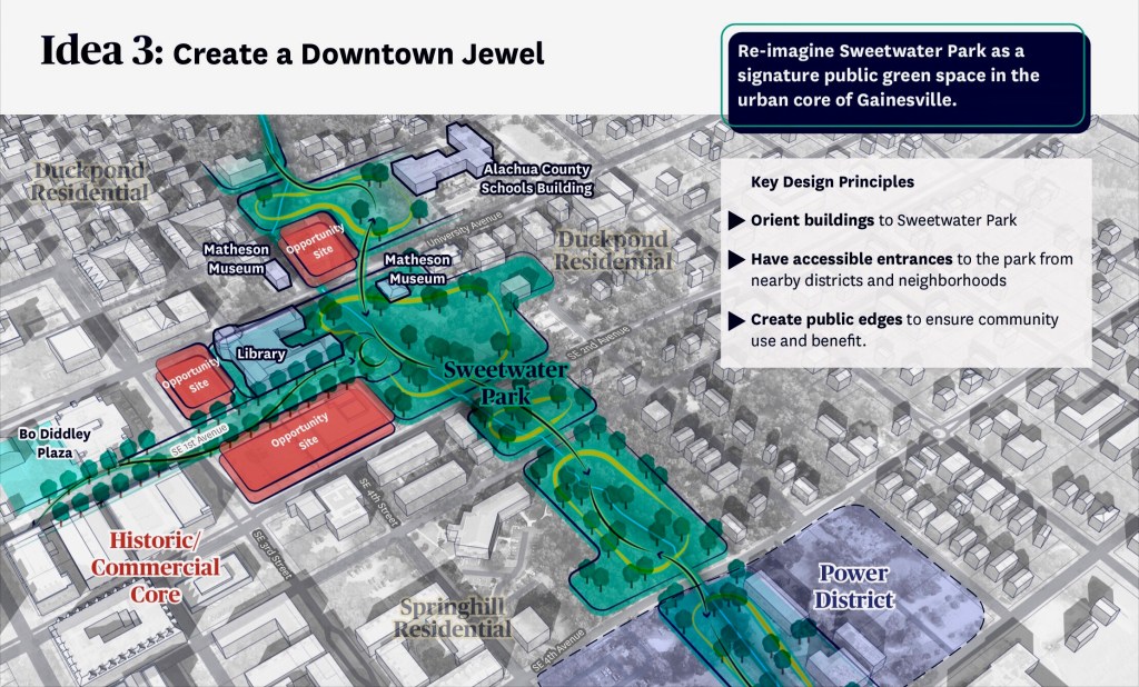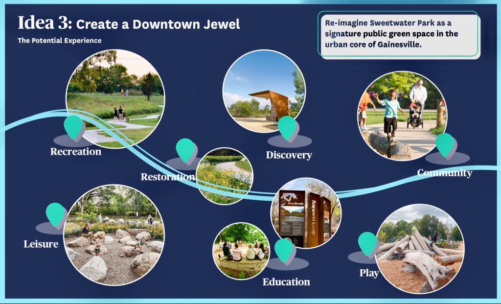 First is the importance of transforming Sweetwater Branch Park from a neglected backwater into a “Downtown Jewel.”