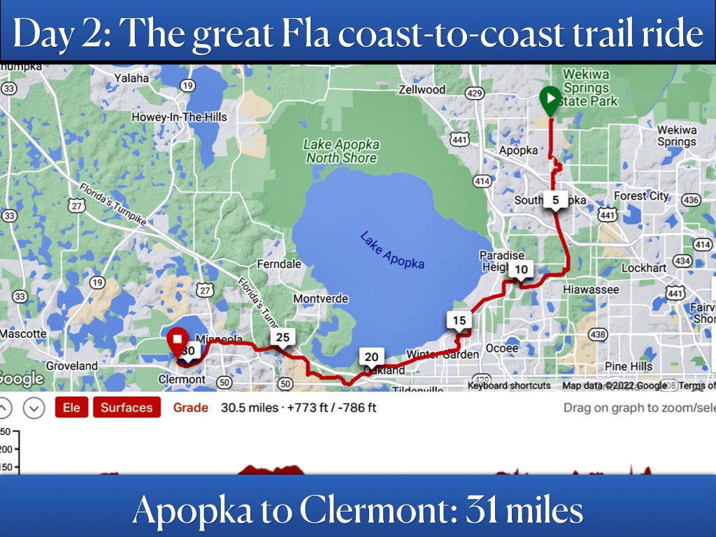 Day 1 of our great Florida coast-to-coast trail ride saw us navigating the swamps, palmetto scrubs and backwoods of rural Volusia County. Day 2 was quite a different cycling experience: A ride through the heart of urban Orange County.