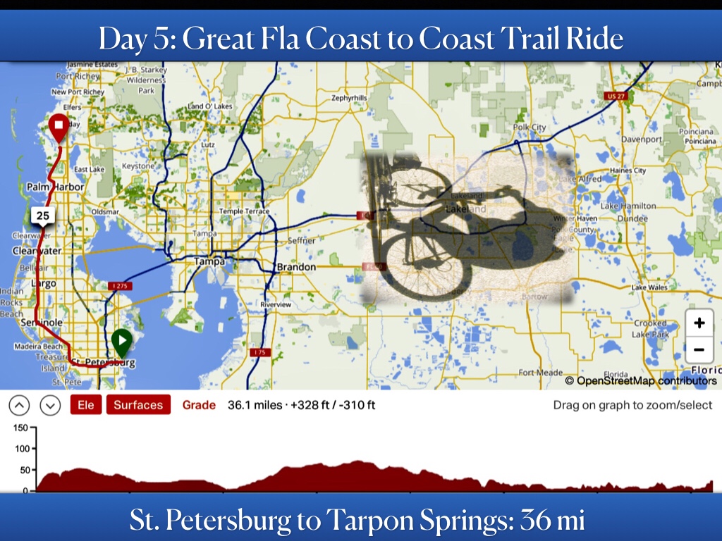 Some folks who have been following my blogs about our adventures on the Great Florida Cross State Trail Ride have asked for links to the actual maps we used. I’m happy to oblige. The following links are all done on Ride With GPS, so you may have to download the app to take them with you.