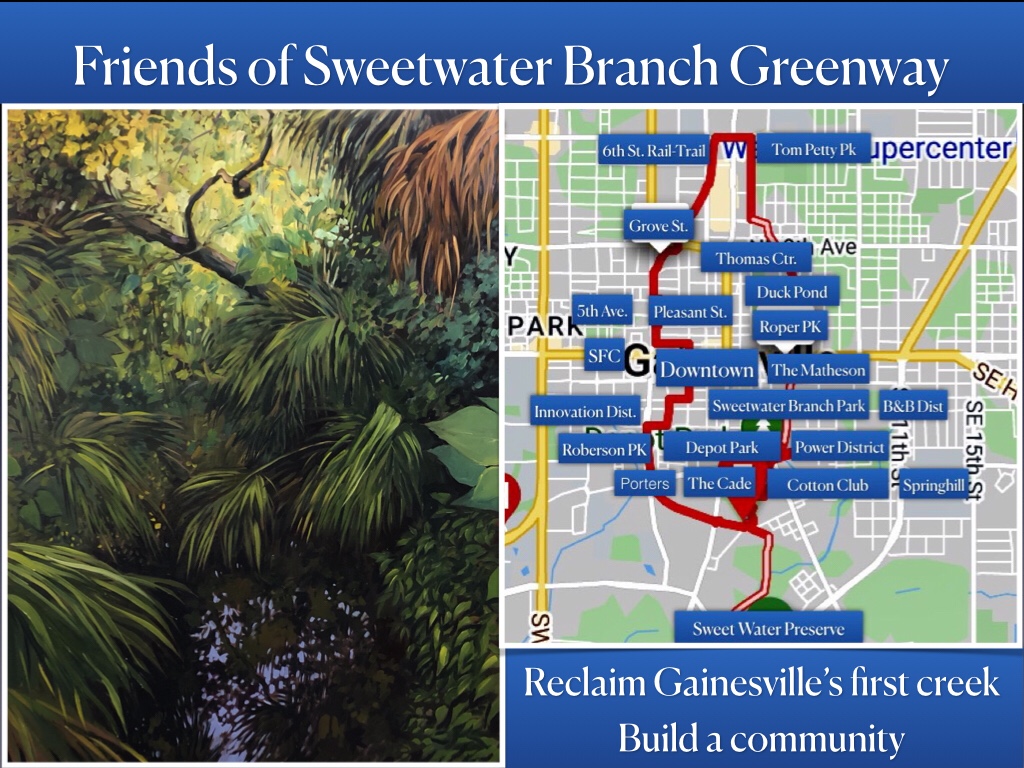Hello. If you have been following our Facebook page (Sweetwater Branch Greenway Loop) you already know that a handful of GNV residents have been promoting a vision to create a greenway along the path of Gainesville’s Sweetwater Branch Creek and then link it up with the 6th Street Rail-Trail.