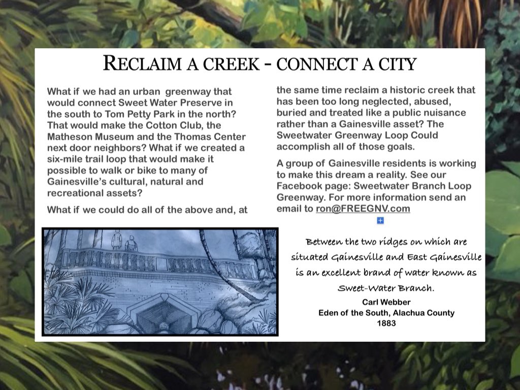 Listen, we have it in our power to bring back Gainesville’s First Creek. And in the process we can create a people-to-people connector between neighborhoods in the very heart of our city.
