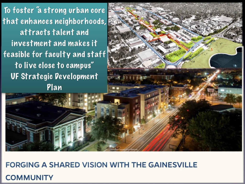 And I especially think it significant that UF’s strategic planning efforts recognizes the importance of fostering “a strong urban core that enhances neighborhoods, attracts talent and investment and makes it feasible for faculty and staff to live close to campus”