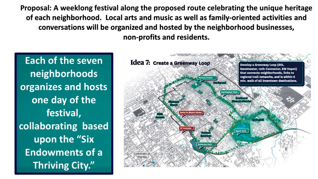 The loop would run through six of Gainesville’s oldest neighborhoods – Springhill, the Duck Pond, Grove Street, Fifth Avenue, Porter’s Quarters, Downtown and Depot Park and the Power District. The lab is proposing a multi-day series of festivals, one in each neighborhood, to heighten awareness of the loop and its community building potential.