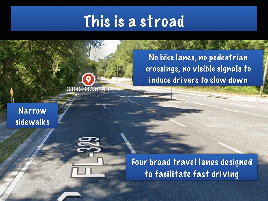 Conversely, the length of South Main Street from SW 16th to Williston Road is a textbook example of a “stroad.” The main function of a stroad is to facilitate the fast and efficient movement of cars with little or no regard for the safety of pedestrians, cyclists and other living things.