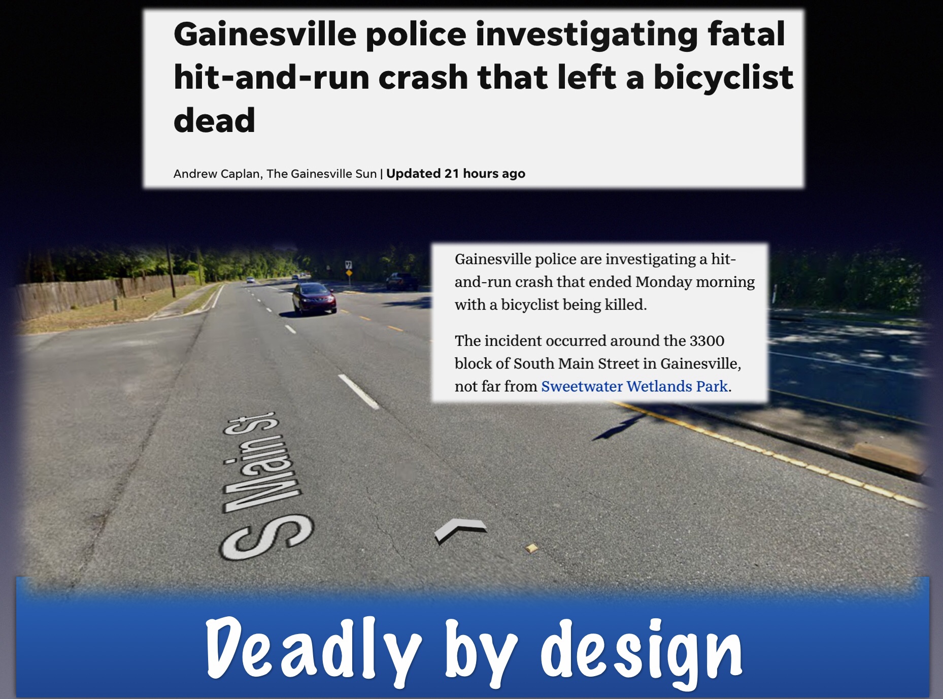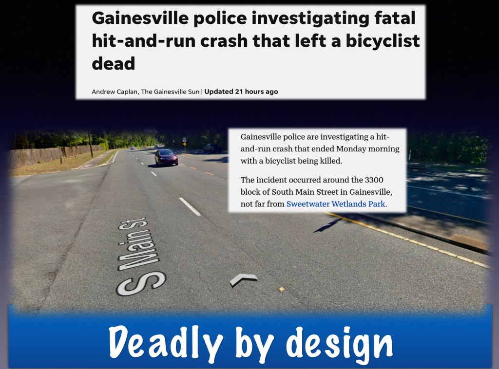 Correction: An earlier version of this blog stated that the section of South Main Street where a cyclist was killed by a hit-and-run driver on Monday was controlled by the Florida Department of Transportation. That is incorrect: That section of North Main Street is owned by Alachua County. I apologize for the error.