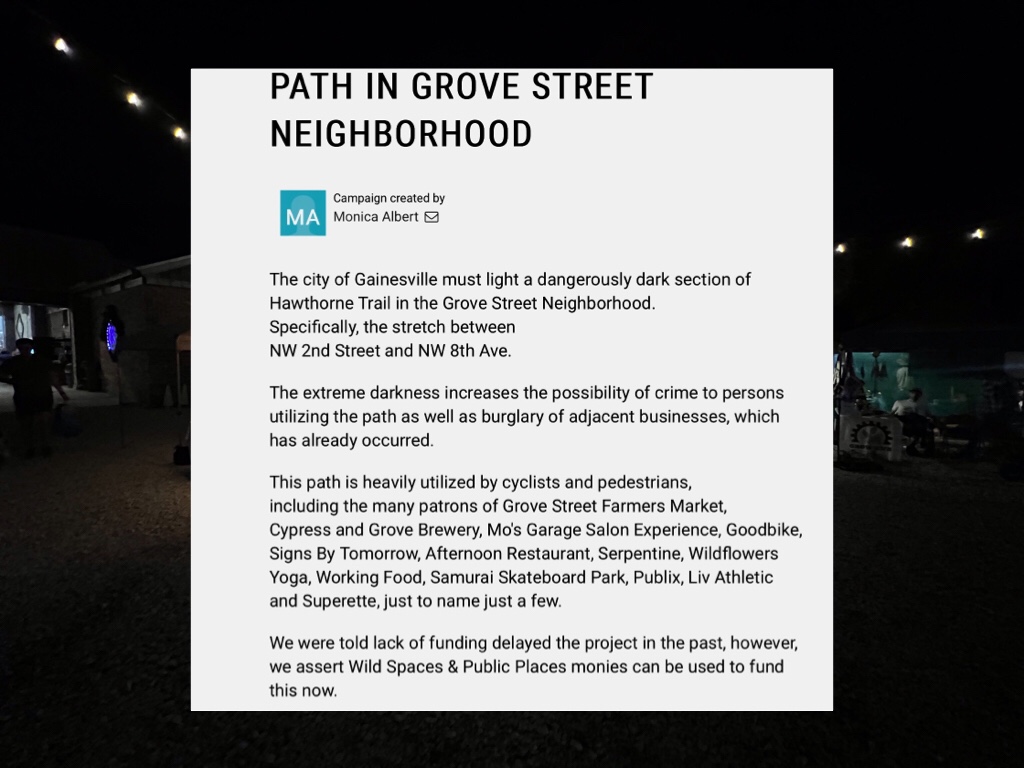 Which is why neighborhood boosters and businesses are petitioning the city to provide lighting along a “dangerously dark” section of the trail between NW 2nd St. and NW 8th Ave.