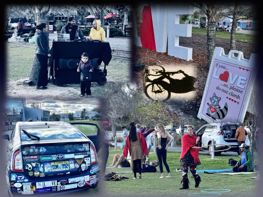 Pushing on to Depot Park I found a beehive of activity involving hula hoops, the world’s most stickered car, a kid determined to break into the DJ biz and a raccoon who apparently didn’t want anybody to climb all over love. (For the record, I wasn’t gonna.)