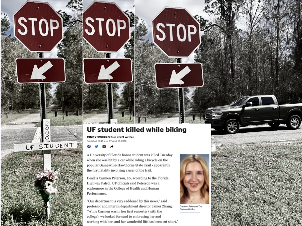 On the ride I noticed a wooden cross where CR 325 intersects with the trial. Fifteen years after a UF student was killed there, someone is still leaving flowers in her memory. It is a sober reminder that trail users really do need to stop and look before crossing a dangerous rural road.