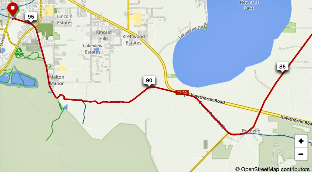 I got onto the Gainesville-Hawthorne Trail at Rochelle, 87 miles into the ride. To make my 100 mile goal I would have had to go east a couple miles past CR 325, turn around and head back to the GNV end.