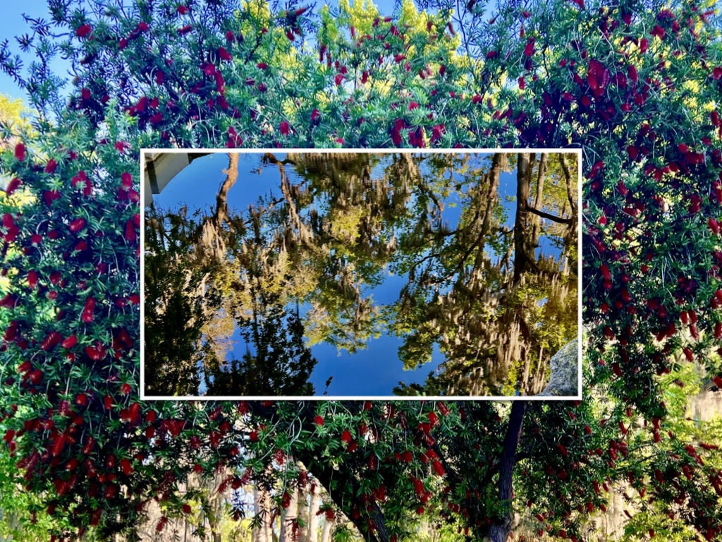 Looking up there is an explosion of red blossoms. Look down and giant trees stare back up at you from a liquid mirror.