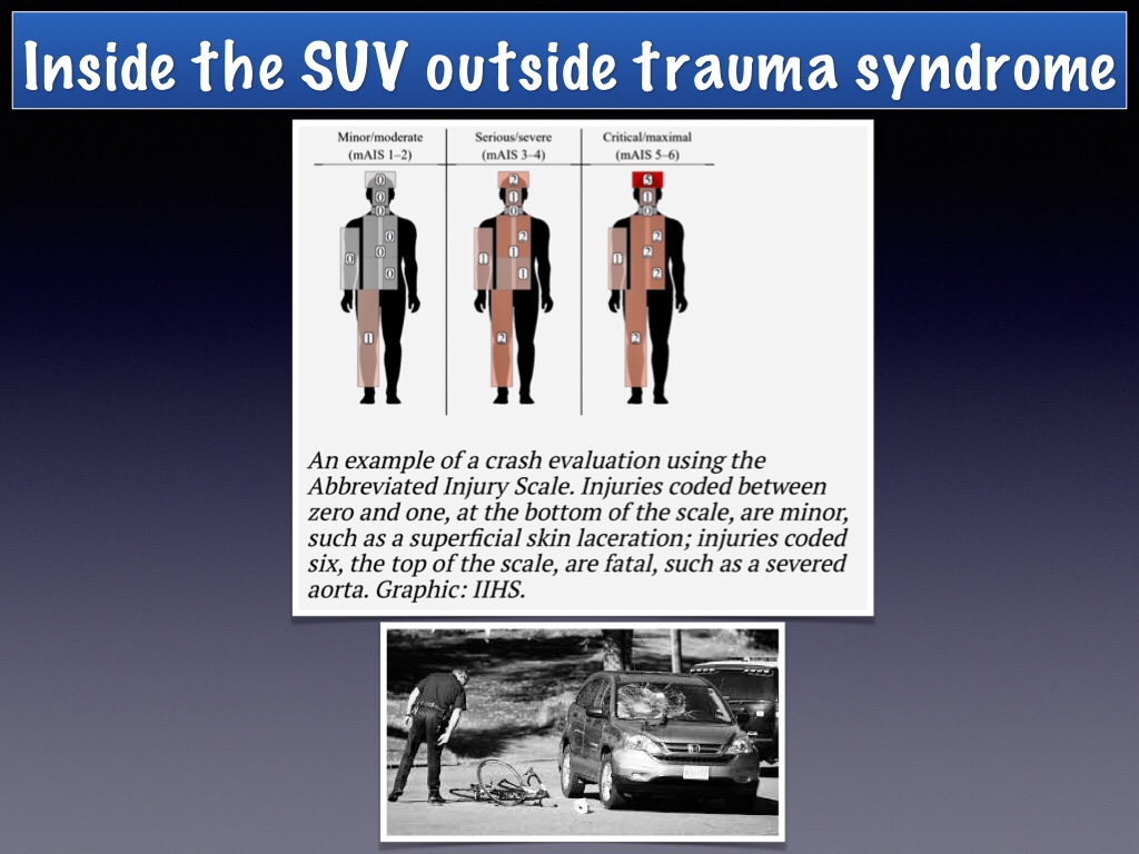 This from Streetsblog: According to the Abbreviated Injury Scale — a medical coding system that grades the severity of harm caused to the body after a trauma — cyclists hit by SUVs sustained injuries that were 55 percent worse than those struck by smaller vehicles.