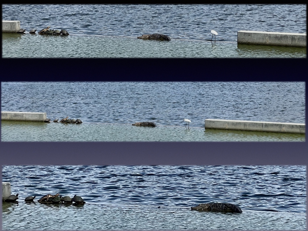 Arriving at Depot Park I noticed a rather tense standoff between a gaggle of turtles and a supine gator. Neither side seemingly inclined to cede an inch to the other.
