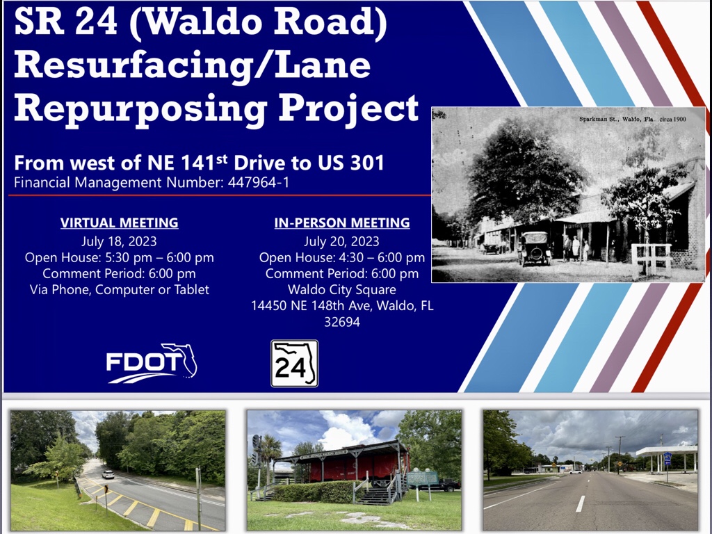 “The City of Waldo expressed interest in providing a more bicycle and pedestrian friendly facility to encourage economic development in the area,” says an FDOT information packet. “This project proposes to repurpose SR 24 (Waldo Road) to serve all users: people who walk, bicycle or drive.”