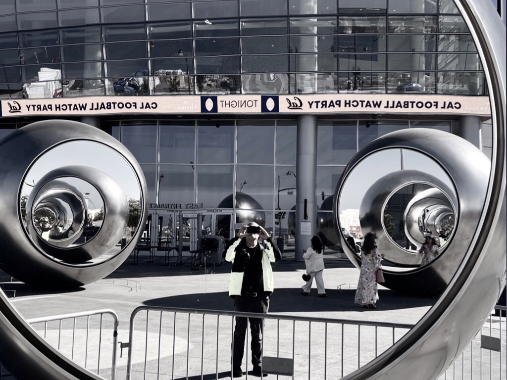Seeing spheres consists of five fifteen-and-a-half-feet-tall polished hydroformed steel spheres that stand in a circle around a central space.