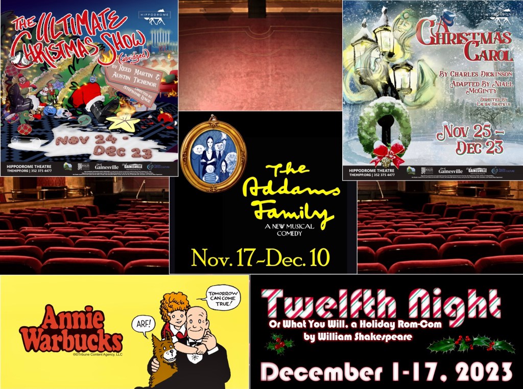 On Nov. 17 the Gainesville Community Playhouse will kick off the holiday season with the musical comedy “The Addams Family.” Then, on Nov. 24, the Hippodrome will premier “The Ultimate Christmas Show Abridged.” Followed two days later with a “A Christmas Carol.”