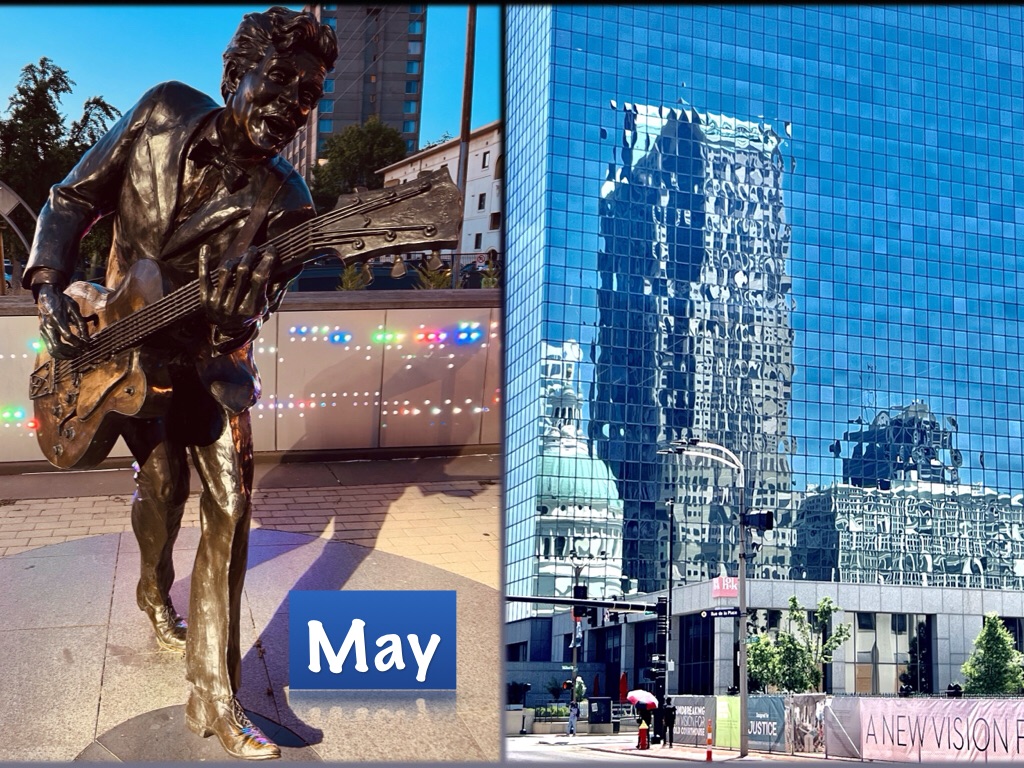 I was out of town during the entire month of May riding my bicycle from D.C. to the Mississippi River. So here’s a statue of Chuck Berry in his hometown and a photo of St. Louis reflecting on itself