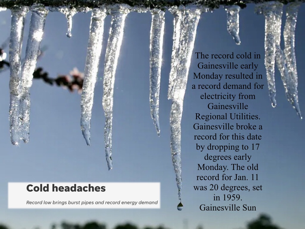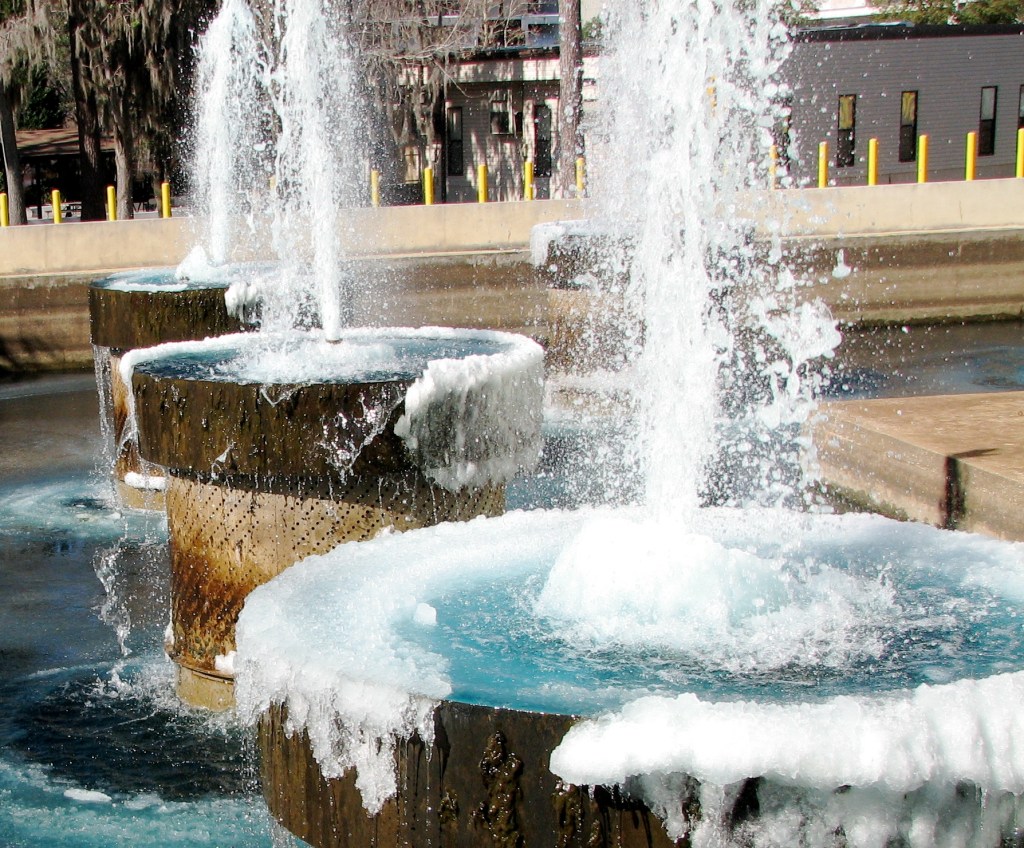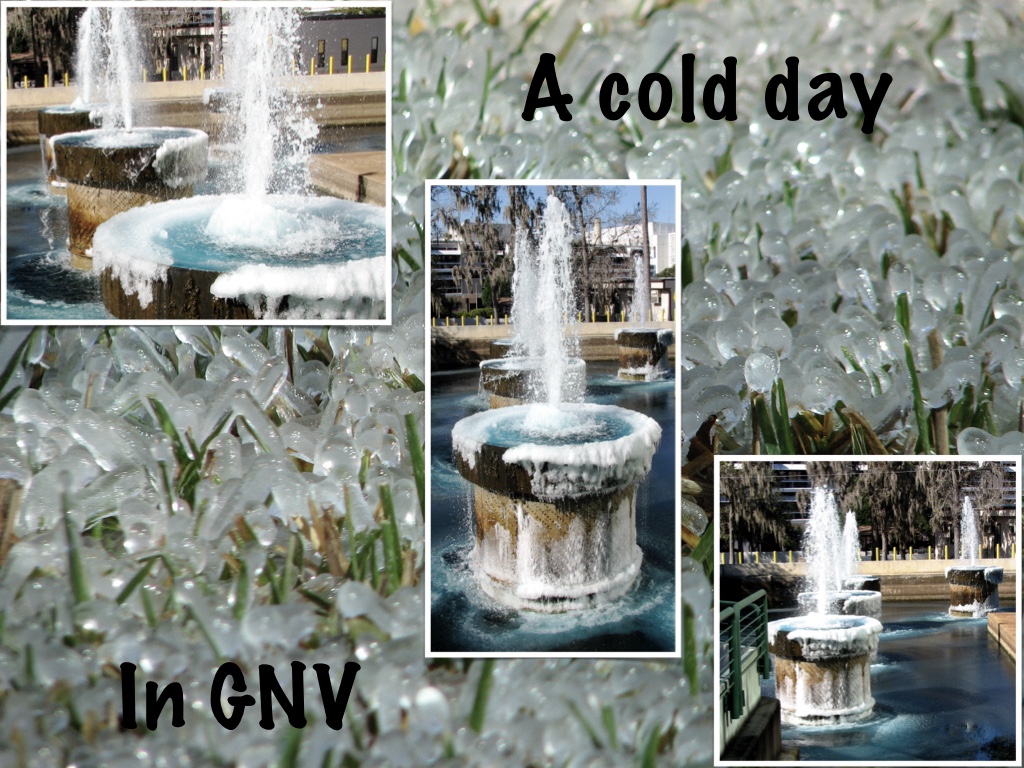 I ran across these images while culling through my photo library the other day. I remember wandering around town taking pictures of ice encrusted grass and snow-rimmed fountains at UF Health Center.