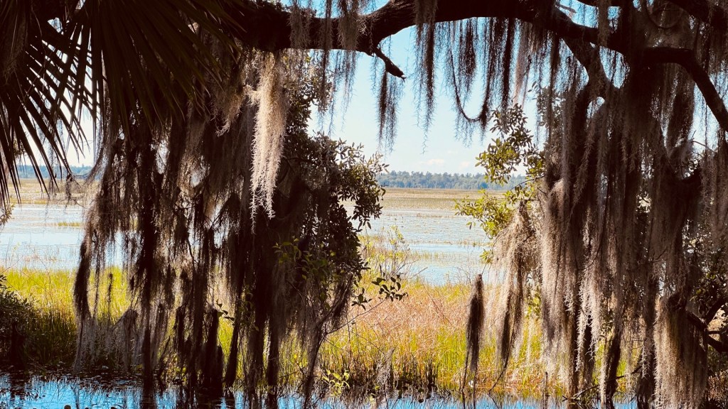 The shoreline being all but obscured by mammoth, Spanish moss-draped oak trees.