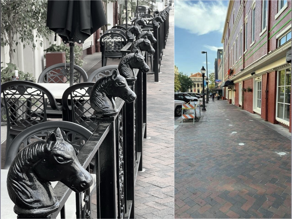 Harrys is a New Orleans style restaurant and has been operating out of the Old Opera House since 1993. The horse head fence added a sort of Bourbon Street panache to downtown’s main drag.
