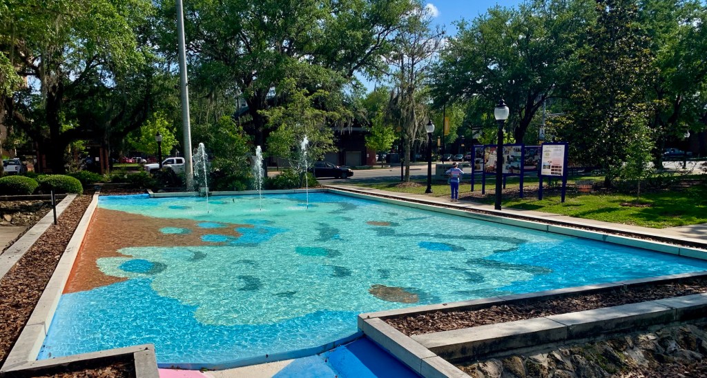 Built in 1968 as part of Gainesville’s new city hall-public library complex, the pools have at one time or another hosted not just fish but large limestone boulders and fountains. Sometimes the water in the pools seemed so artificially blue that jokesters called it “Ti D Bol” water.”