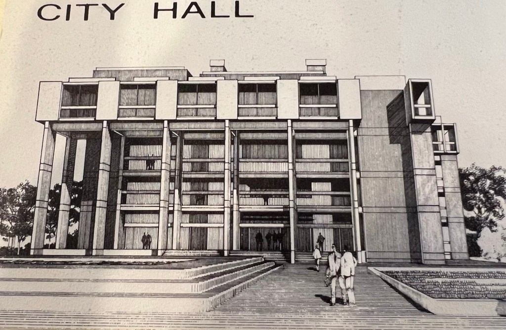 The new city hall was built in the “brutalist” architectural style much in favor in public buildings in the post-World War II era. Brutalist architecture is known to favor functionalism over aesthetics and tends to run toward expanses of textured concrete.