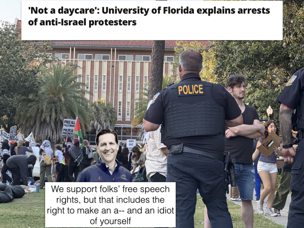 Which made the assertion that “many” of the campus pro-Palestinian demonstrators (who, incidentally, did not get drunk and beat people up) “were outside agitators.”